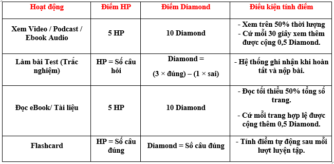 - Số điểm HP và Diamond nhận được cho từng hoạt động
